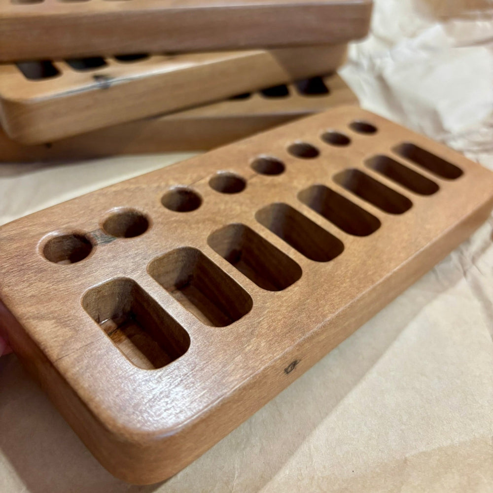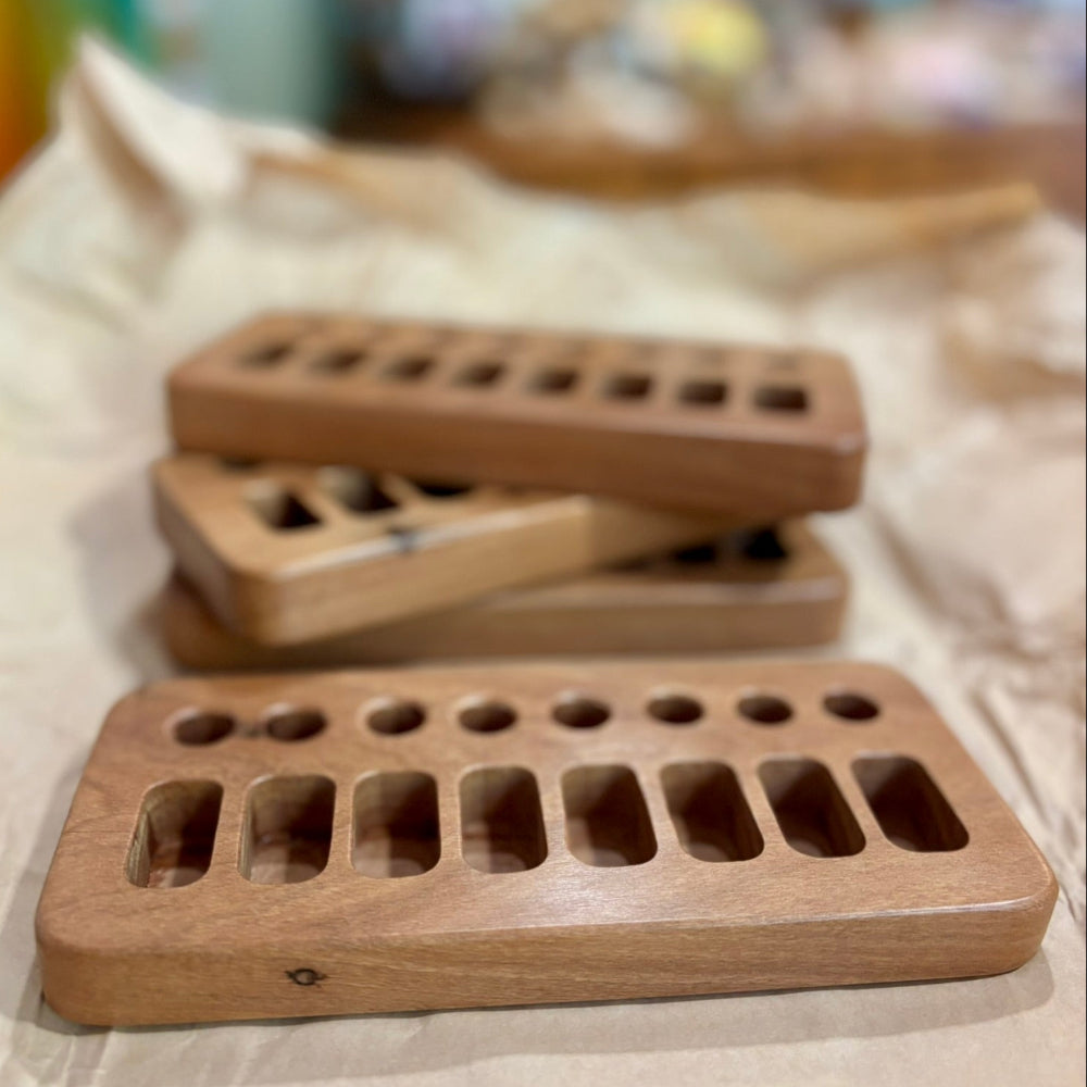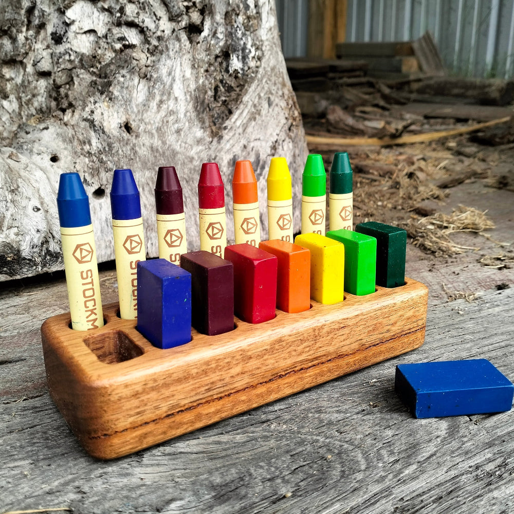 Lovingly made by hand in NSW, Australia from reclaimed ironbark hardwood and finished with natural oil and beeswax, this holder is designed to perfectly cradle 8 Stockmar Stick Crayons and 8 Stockmar Block Crayons. Every piece carries the warmth and character of natural timber and no two are exactly alike.