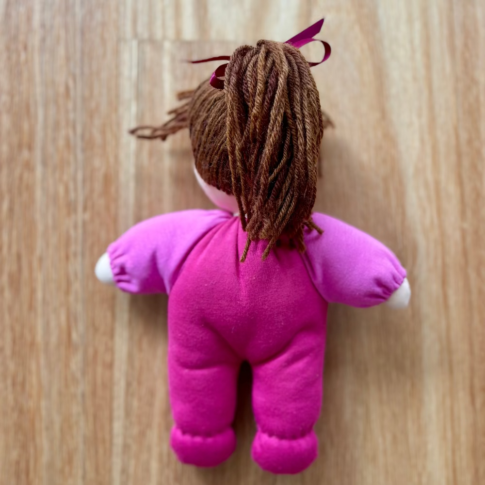 Pink plush Steiner/ Waldorf Doll with brown hair on a wooden surface, back view