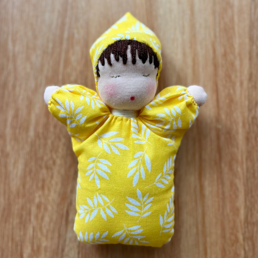 Handmade Mini Steiner/ Waldorf Doll with yellow floral design, front view