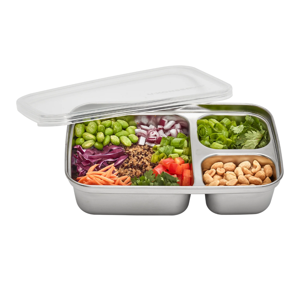 This reusable 3 compartment bento-style lunchbox is versatile enough for many food-storage needs at home and on the go!