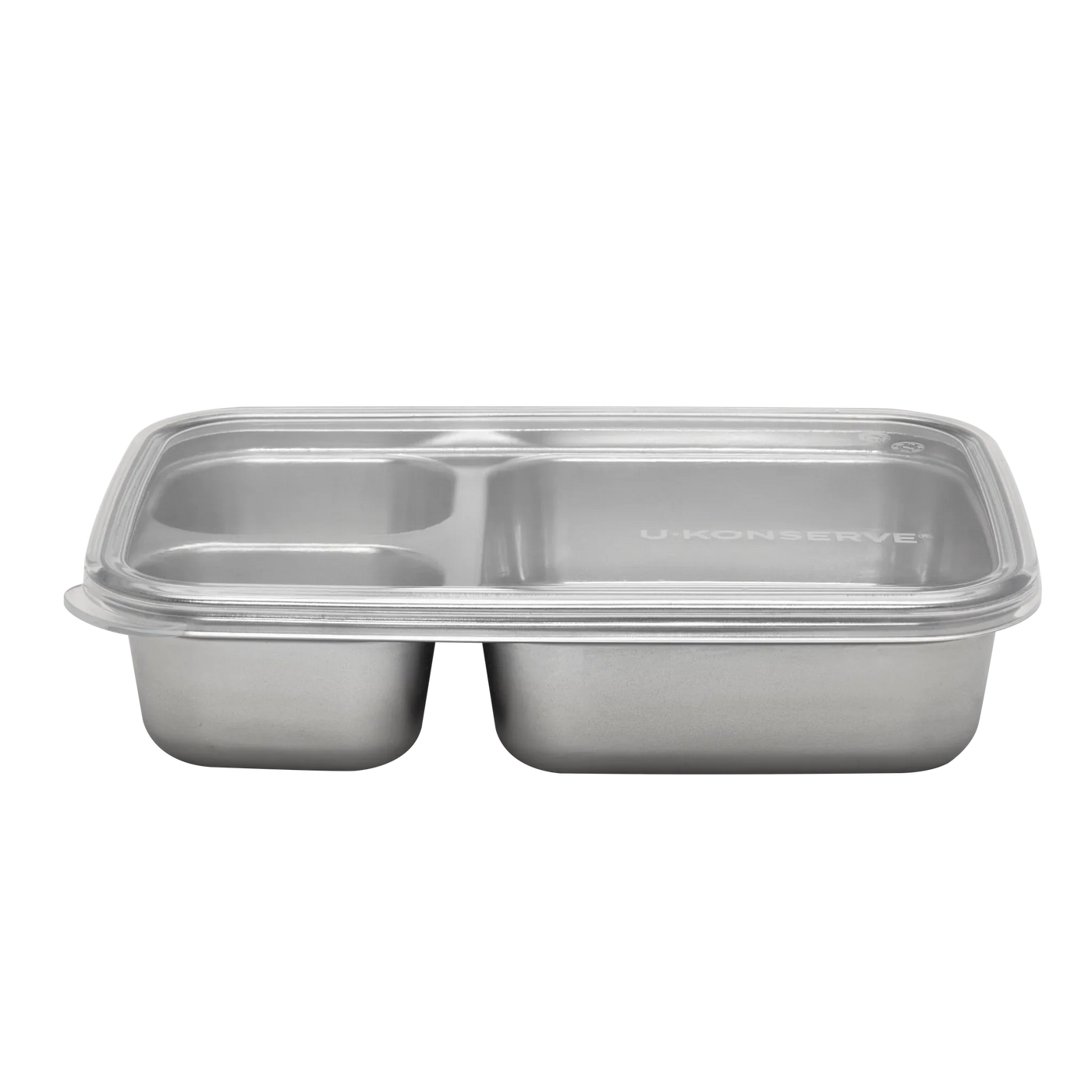 705ml/24oz fill volume, size with lid on: 21.5 x 15 x 5.5 cm (lid fits all U-Konserve stainless steel 2 and 3 compartment divided containers)